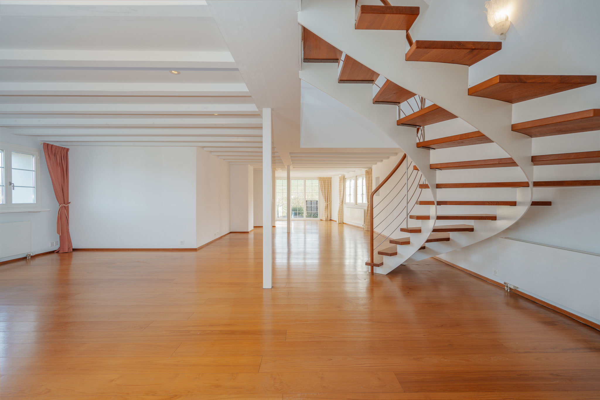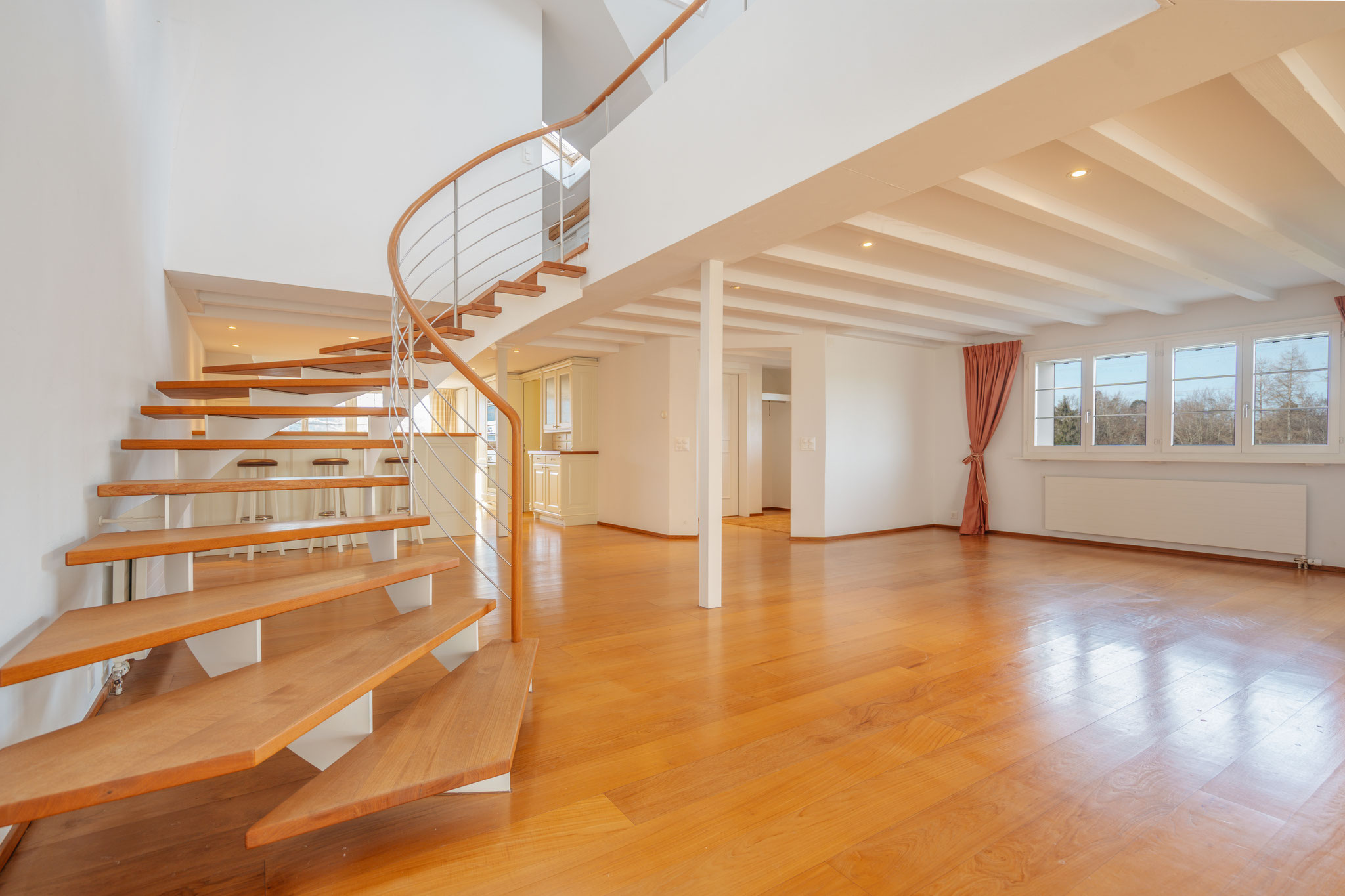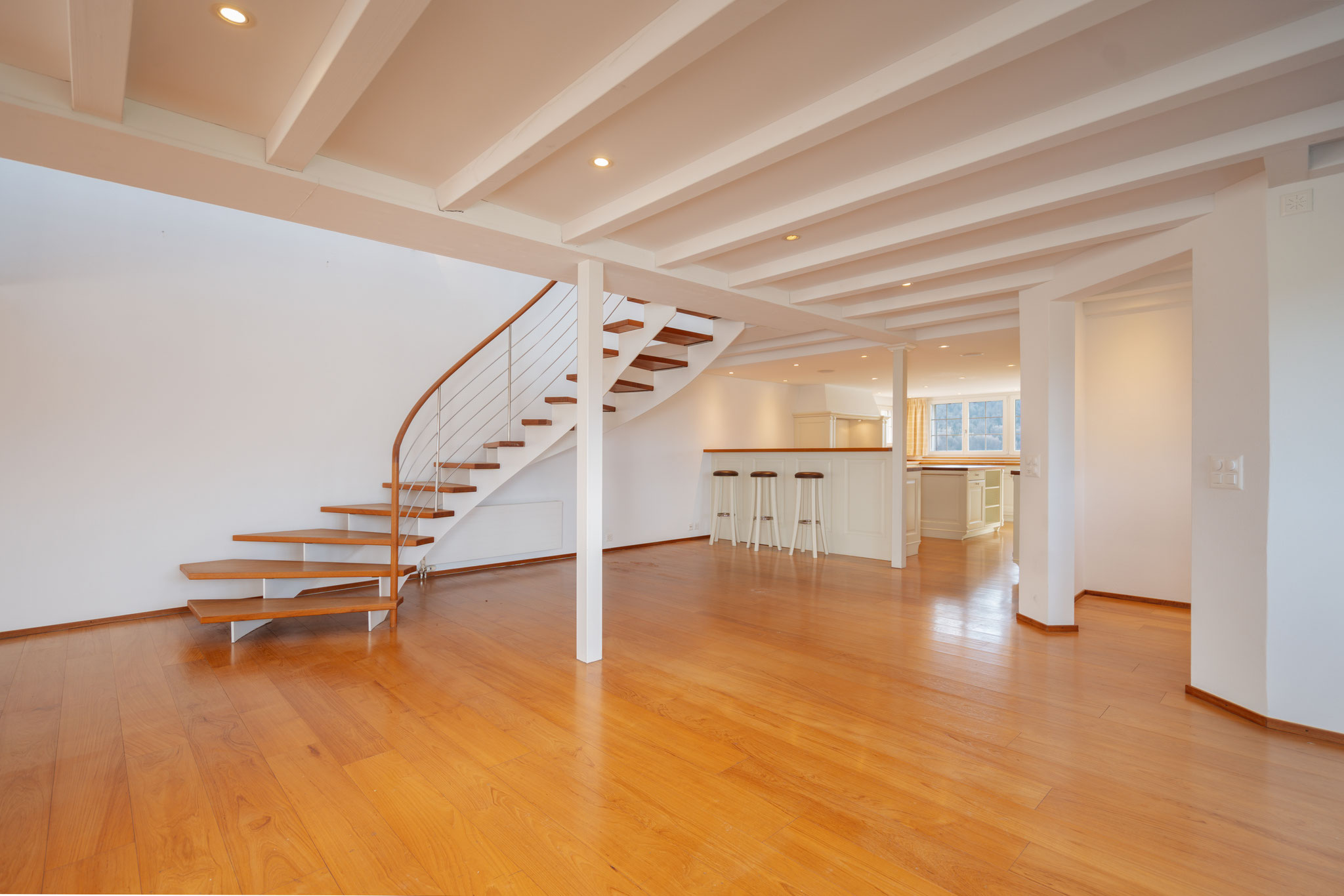Mittelpunkt. Die skulpturale Halbwendeltreppe mit offenen Stufen schenkt ihm einen attraktiven Blickfang, ohne ihm seine Leichtigkeit zu nehmen. Ihm schliesst sich – konsequenterweise nur durch