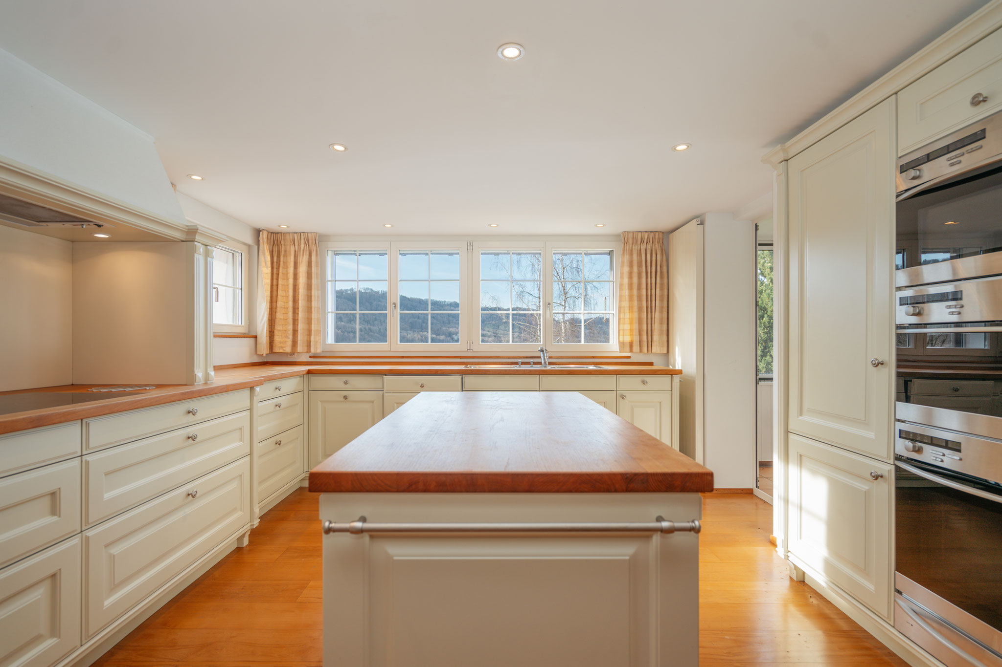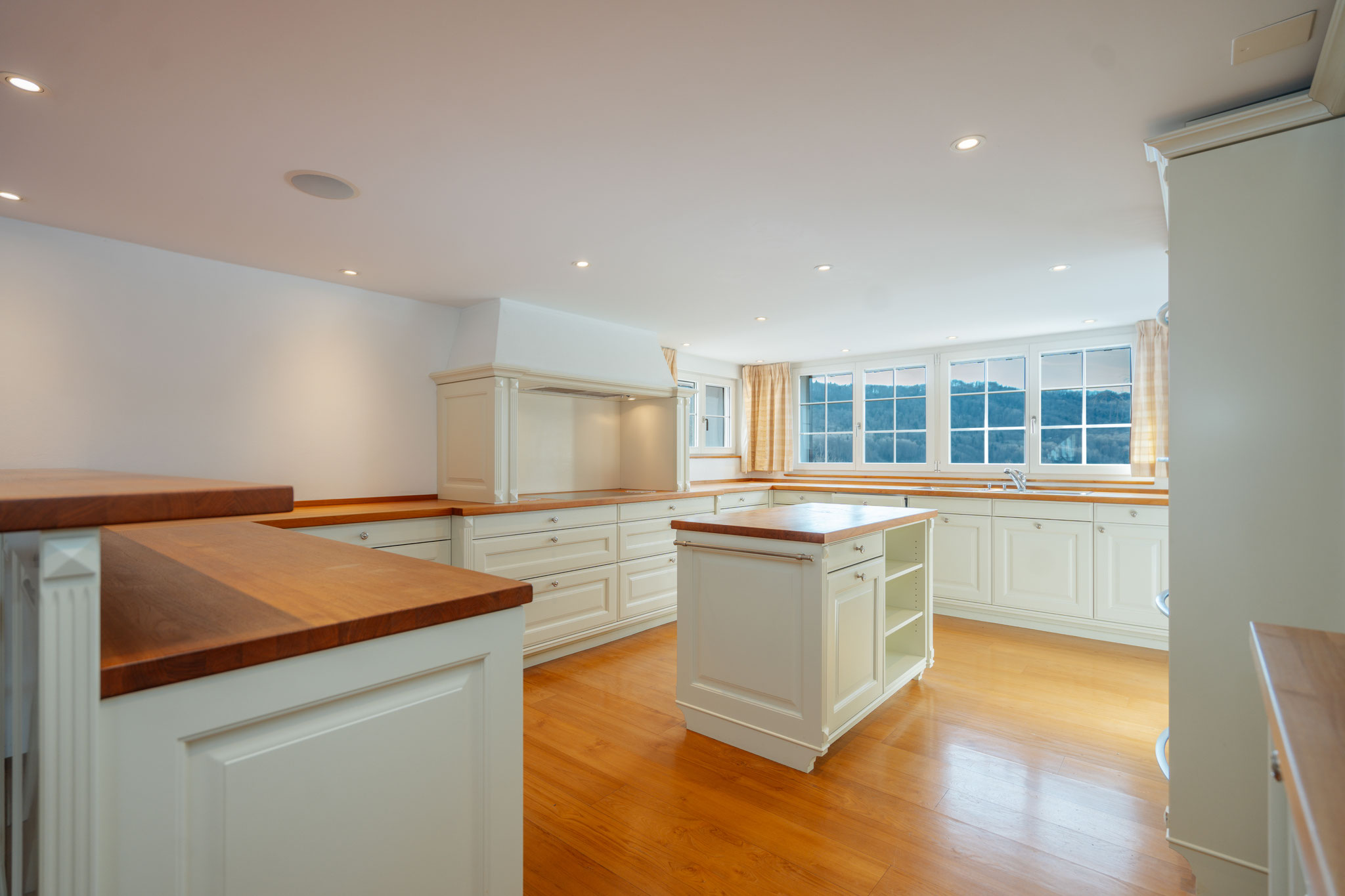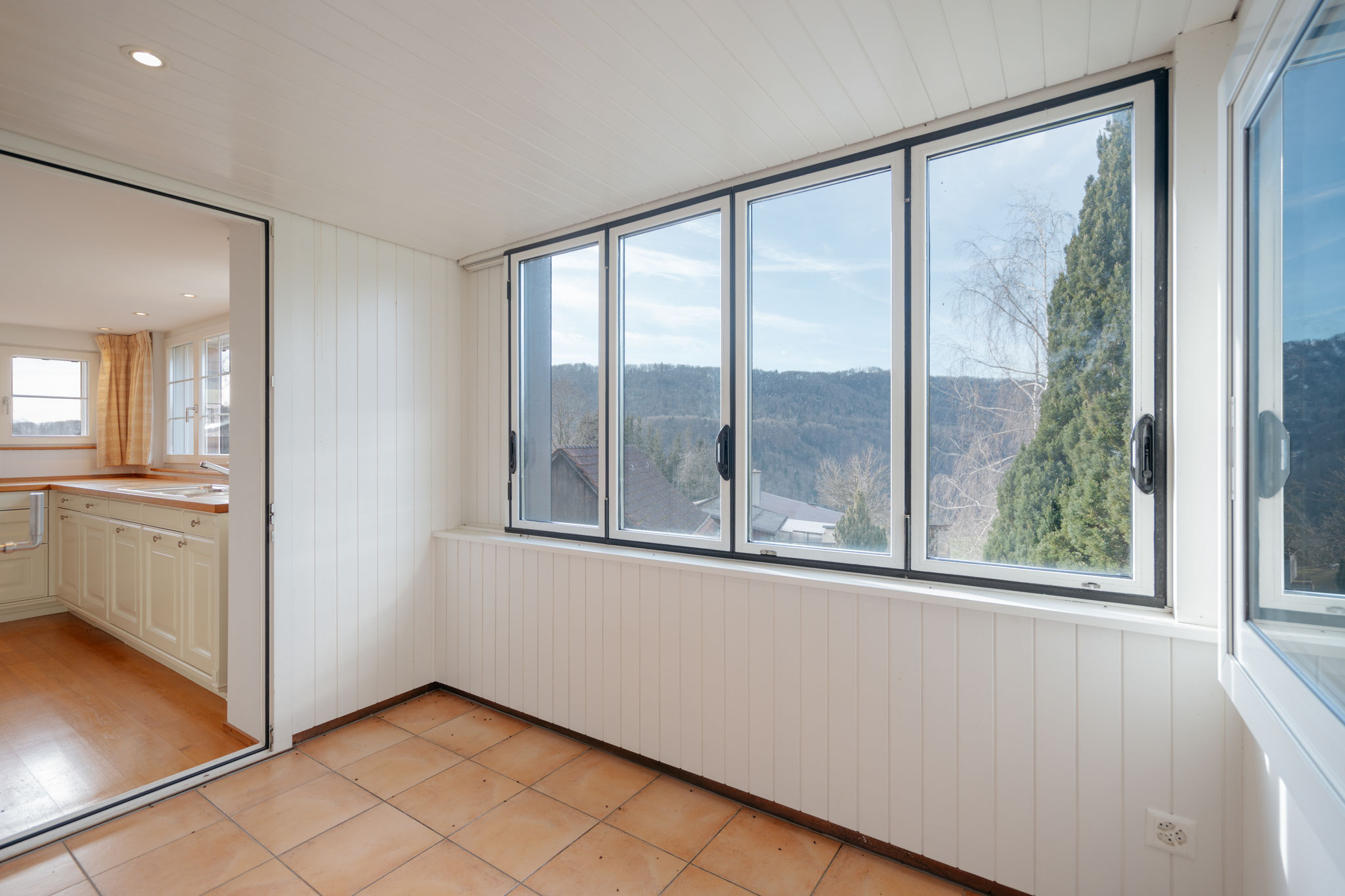 einen Tresen optisch vom Essbereich getrennt – die überaus geräumige, bestens ausgestattete Küche mit Vorratskammer und Wintergarten an.