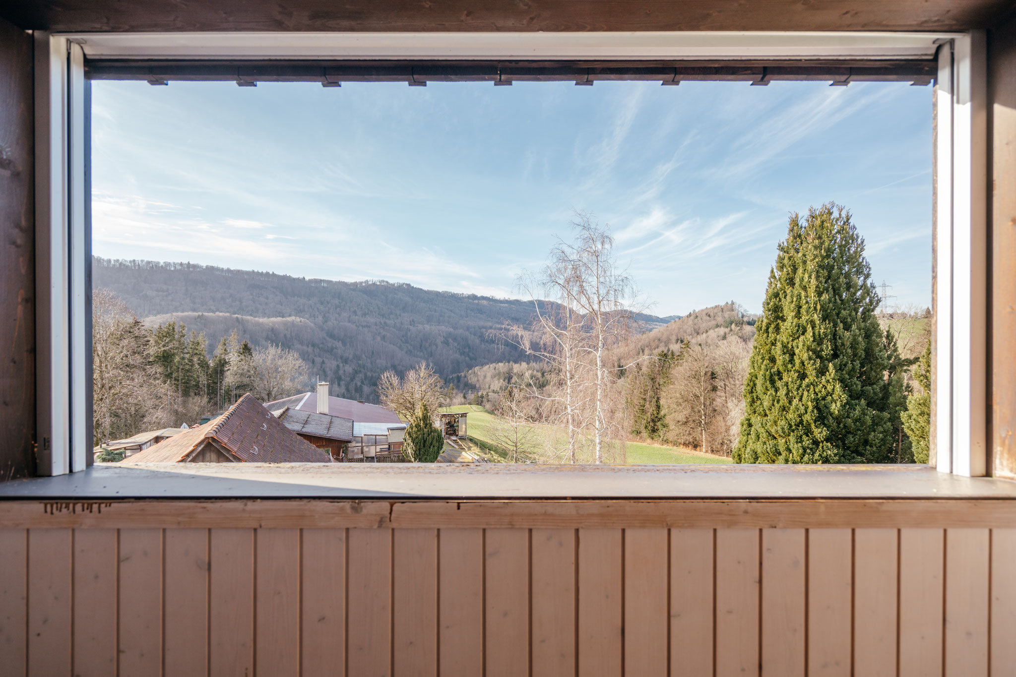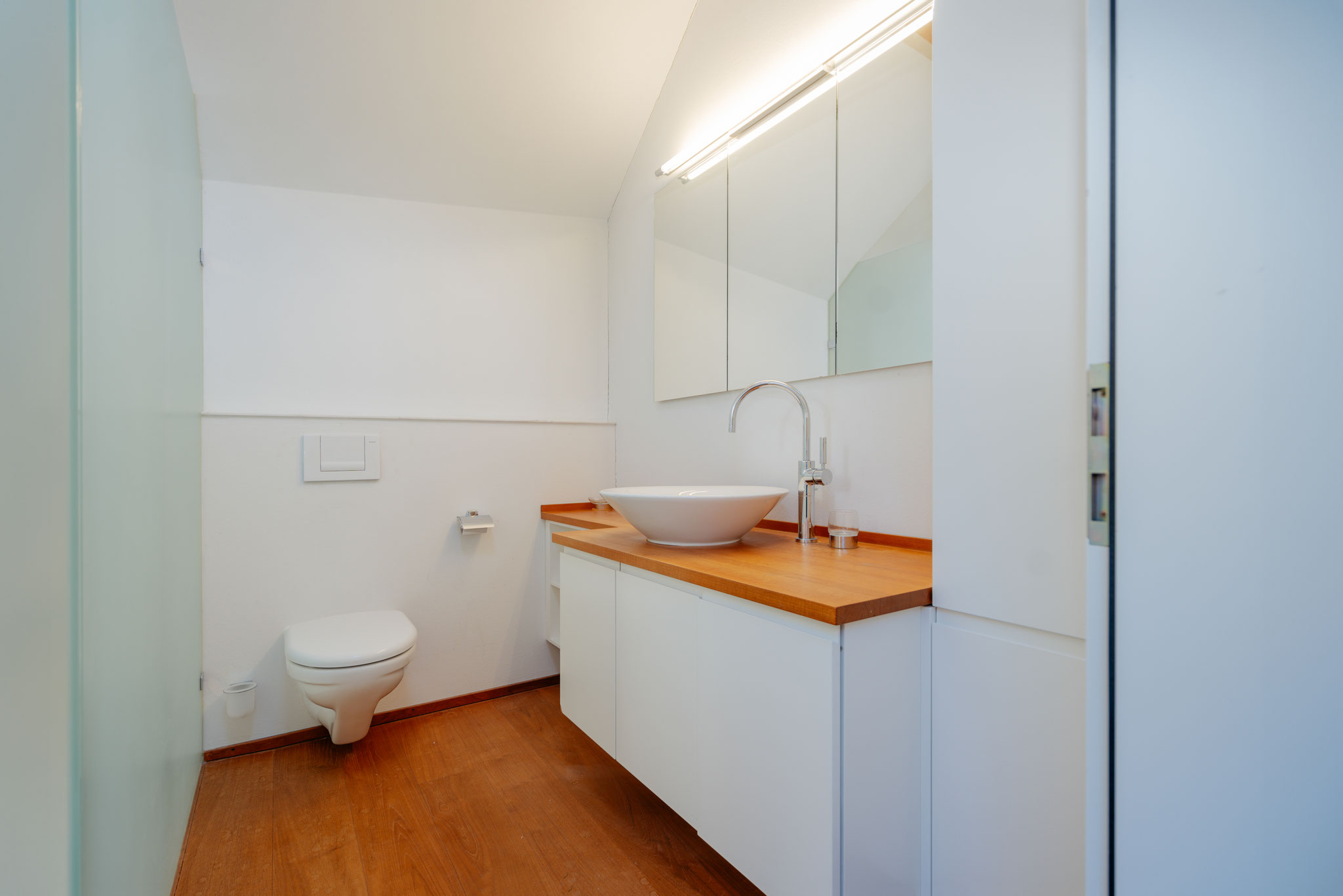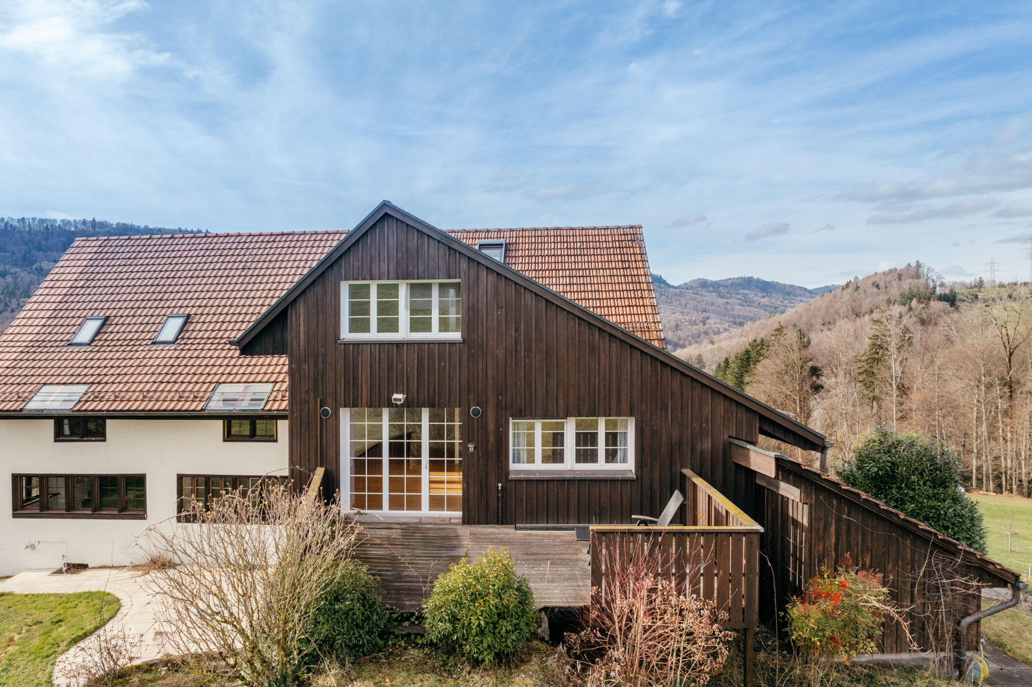 Was diese Wohnung ausserdem auszeichnet, ist Ihr von Sonne und Aussicht verwöhnter Aussenbereich. Wie ein Schiffsdeck schiebt sich die Holzterrasse auf der ehemaligen Scheunenzufahrt in den