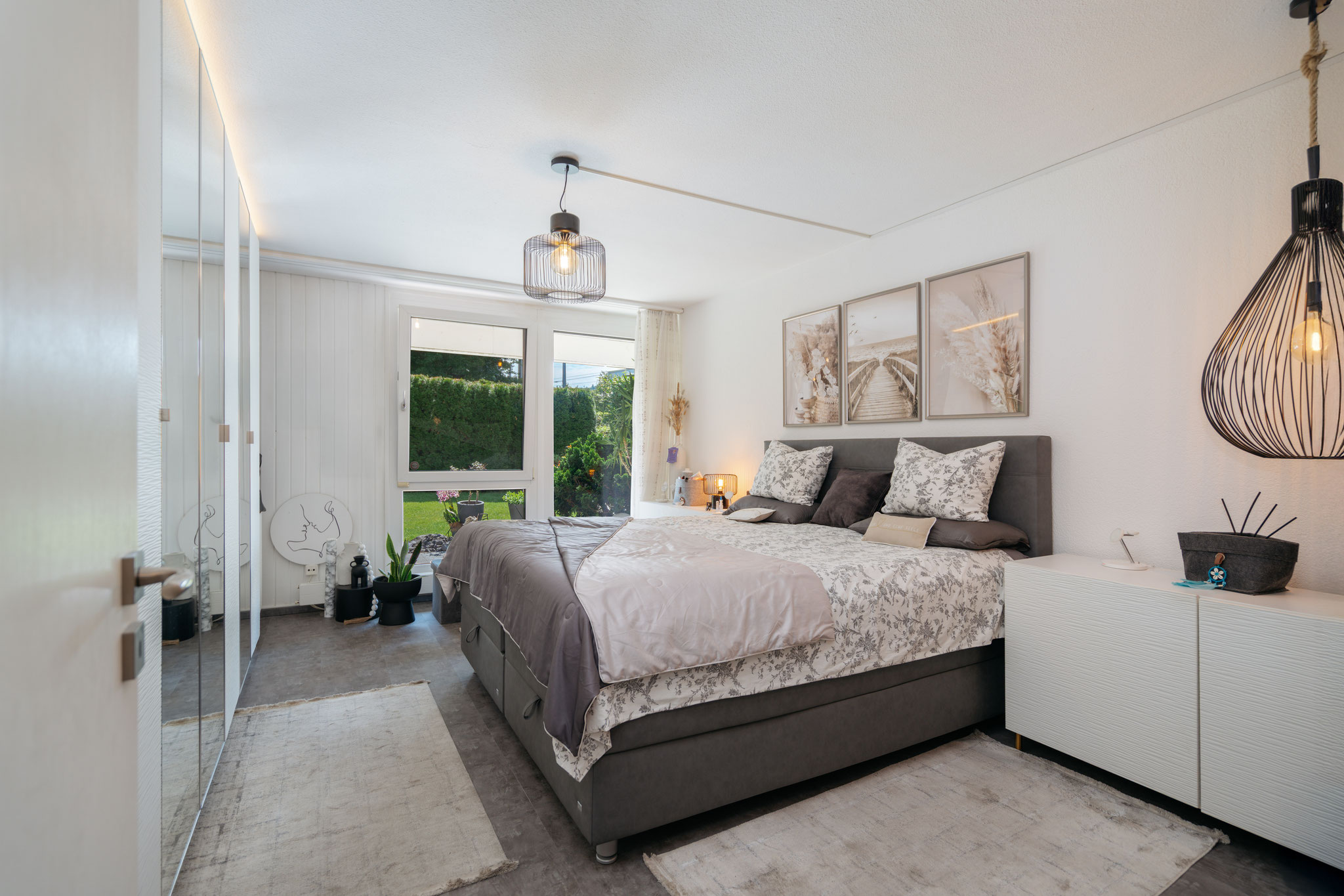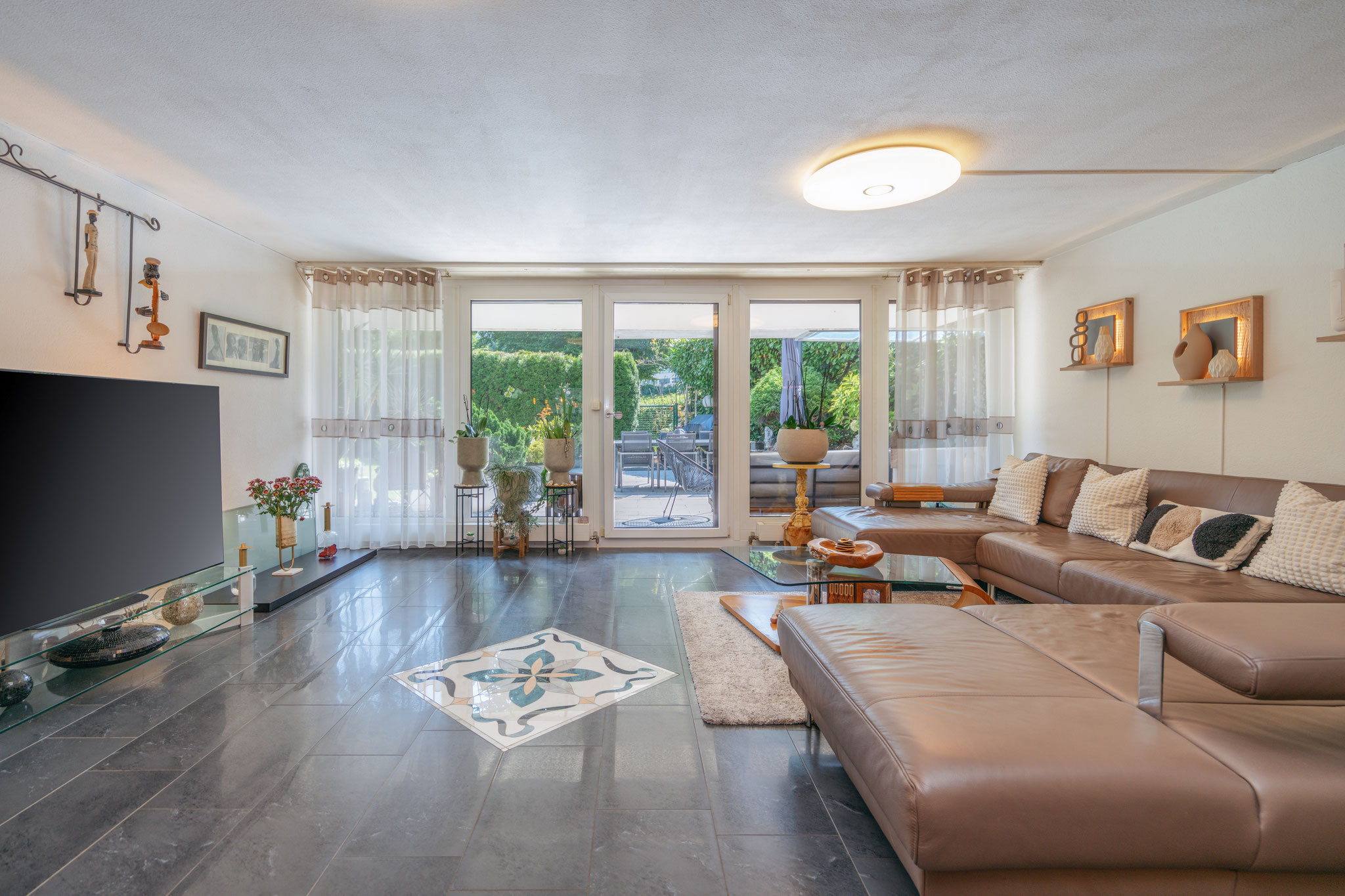 Das klare Herzstück? Ihr privater Garten! Alle Zimmer öffnen sich mit bodentiefen Fenstern zur grünen, von Sonne verwöhnten Oase. Ob alleine auf der Lounge, bei familiären Mahlzeiten oder