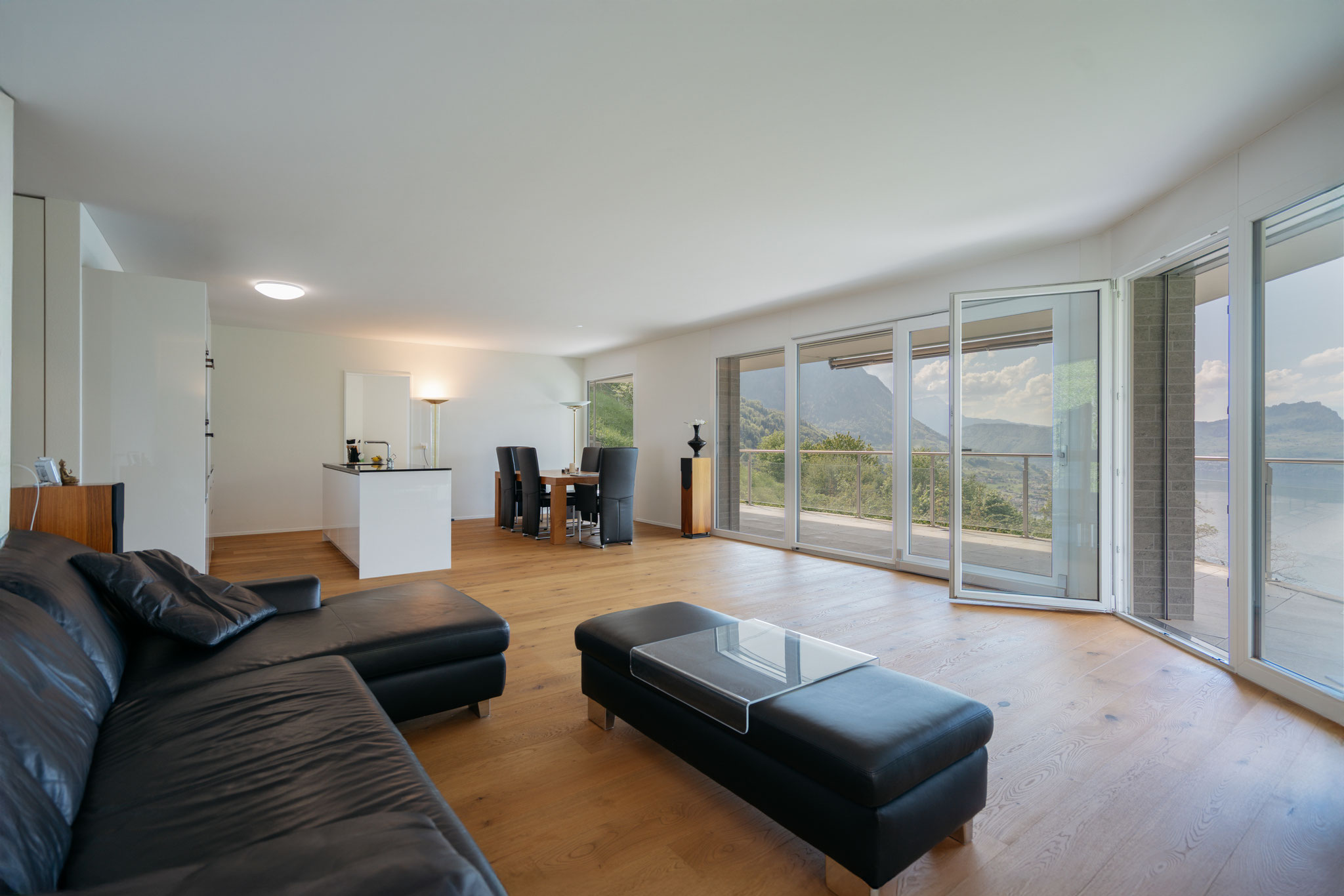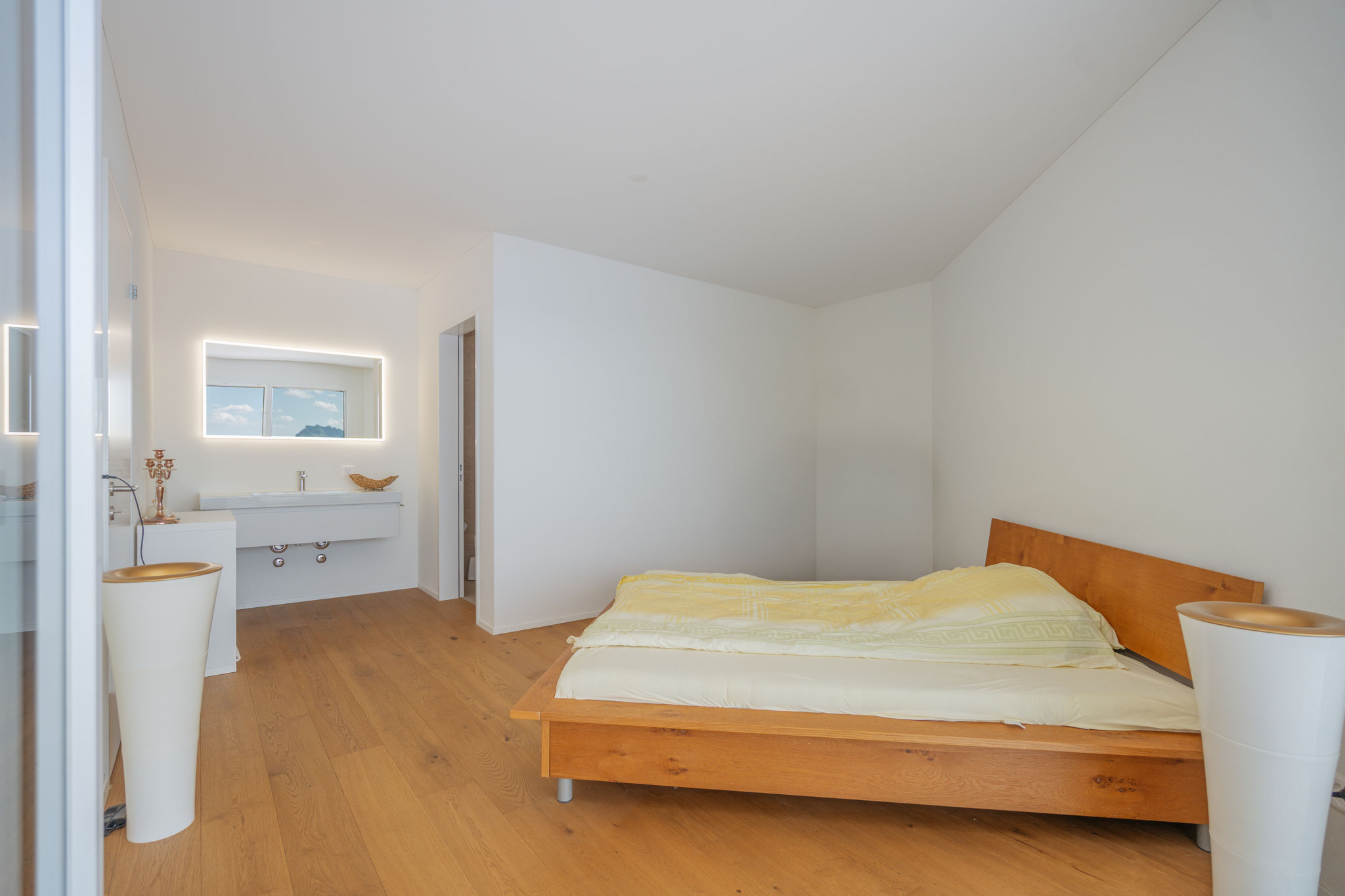 Gäste, aber auch als Homeoffice oder Atelier zum ungestörten Arbeiten. Richtung See öffnen sich der grosszügige Wohn- und Essraum mit integrierter Küche sowie ein weiteres Schlafzimmer mit