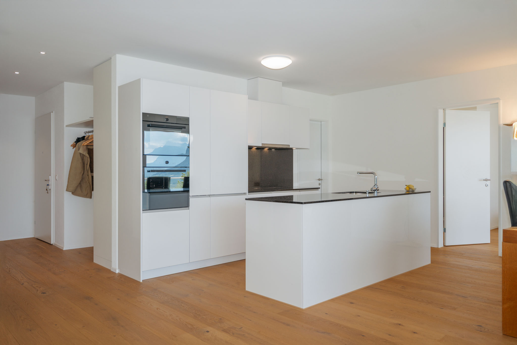 in vollen Zügen geniessen – ob beim Kochen, Essen mit Freunden und morgens nach dem Aufwachen vom Bett aus. In breiten Dielen verlegtes Parkett bildet eine natürlich-warme Basis in den